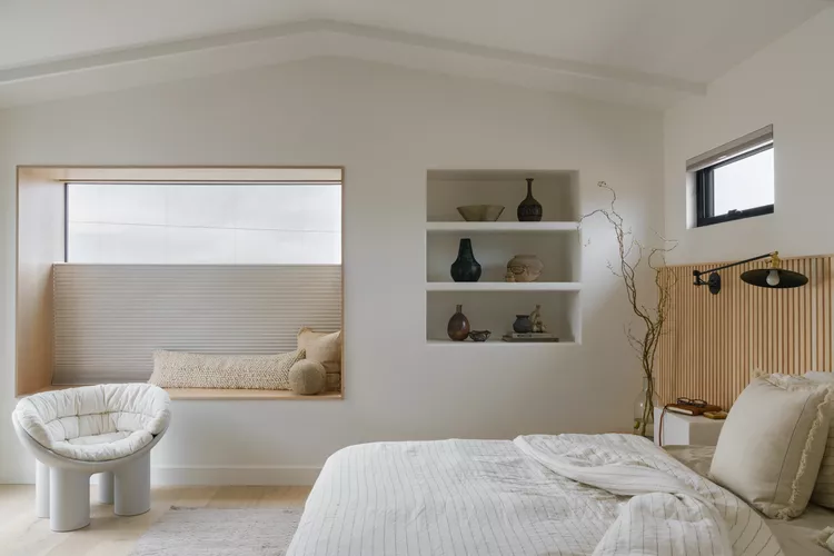 Pick a few things that make you smile like decorative vessels to put on your shelves, like this Japandi-style bedroom which instantly sets the tone for a good night’s sleep.